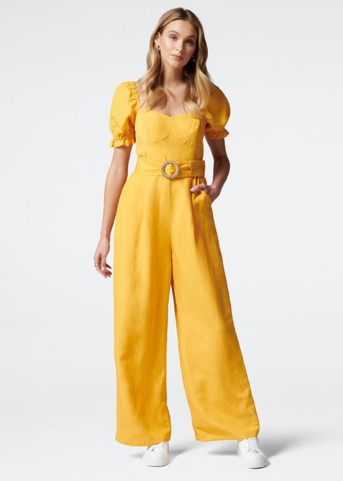 Breezy and bright, this yellow jumpsuit brings to life the summer spirit, also thanks to its linen crafting.