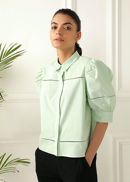 This mint-green shirt, crafted in cotton, with puffed sleeves is all you need for those unplanned virtual meetings. Needless to say, the colour and fabric make it comfortable enough for you to want to wear it all day long.