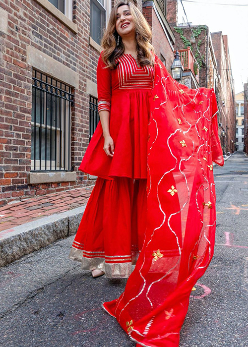 A pop red sharara set with a standout peplum shirt is going to be your favourite go-to festivewear for a long time to come. Enhance your look with a pair of embellished juttis, and you are good to go!