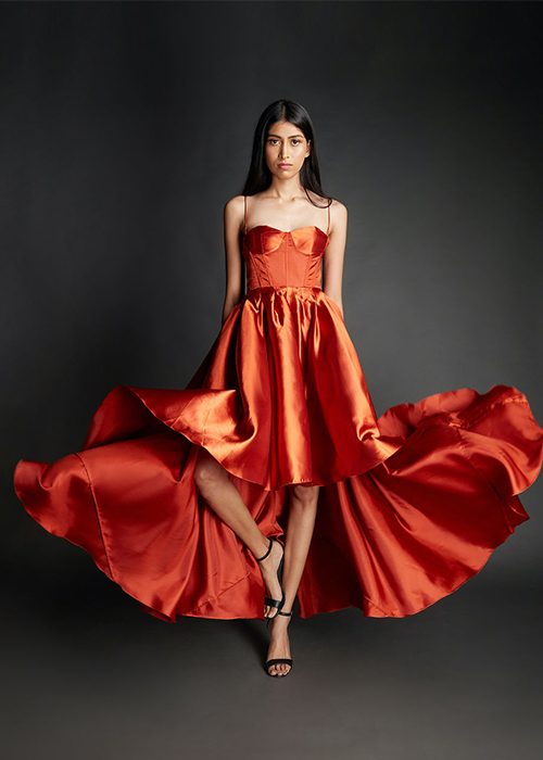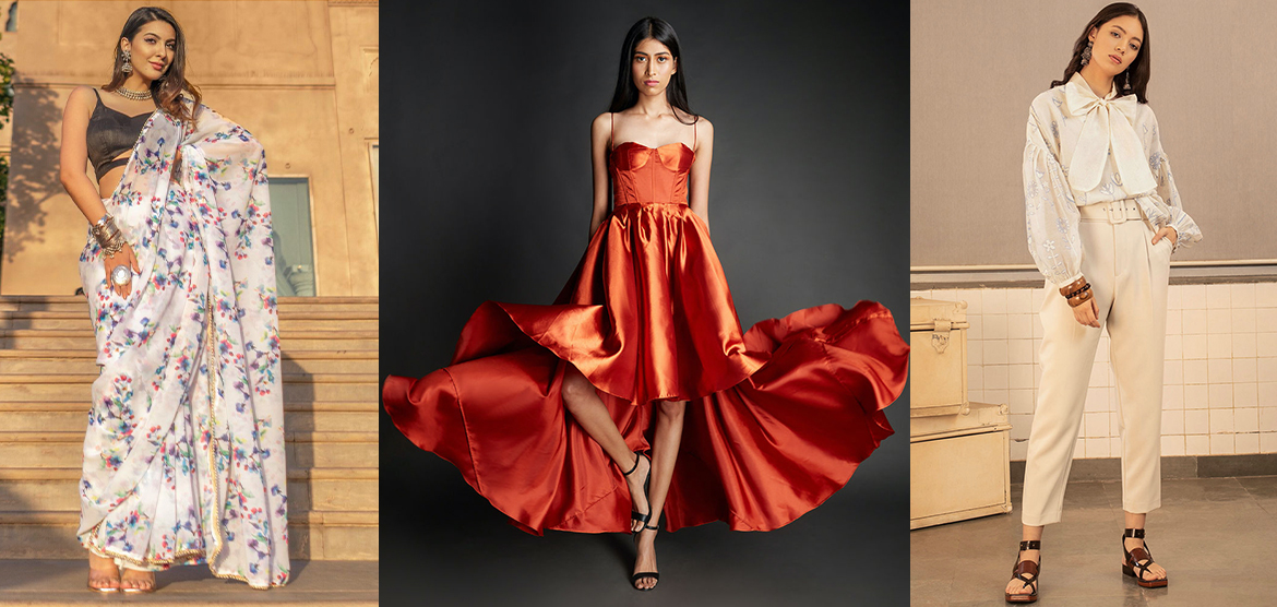 High on regality and sensuality, this satin, asymmetrical number has to be the frontrunner when it comes to dressing up for those big date nights. Also, did you notice the modern-Bridgerton vibe the corset and pleats lend to this rust outfit?