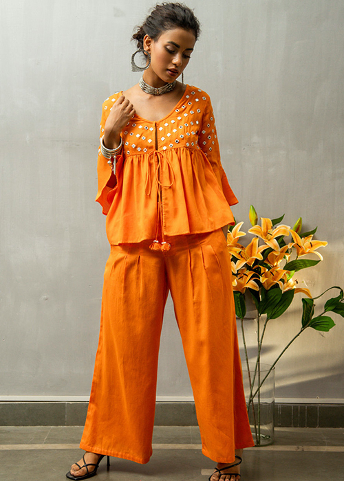 Right from the traditional mirror-work to its boisterous yellow hue, this pant set encapsulates the best of classics with a contemporary touch. Pair it with tan Kolhapuris and statement earrings to round off the look.