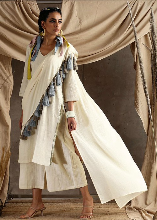 Pre-stitched, tassels and khadi—isn’t this all the comfort and elegance one seeks from a traditional number? Add to that, its ivory white hue that makes it a number you can take from day to night with just the right styling.