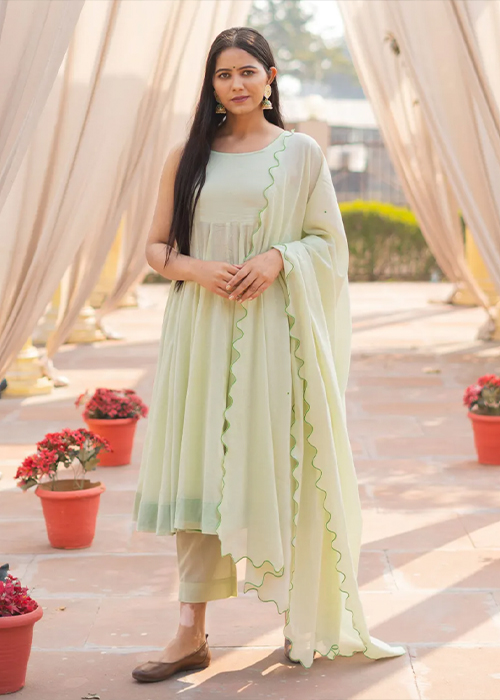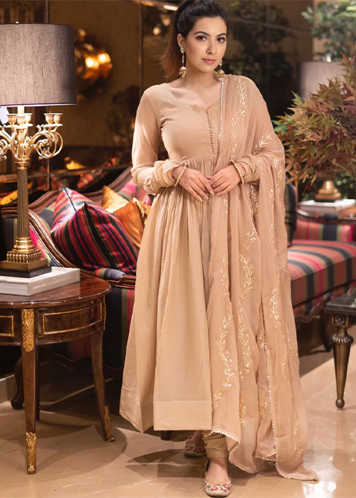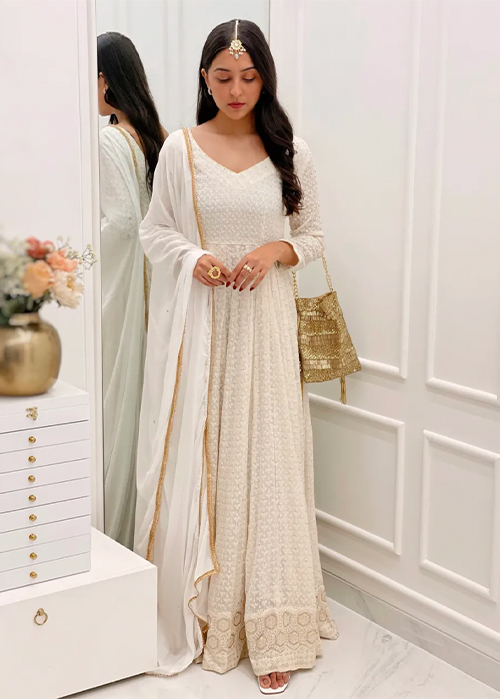A statement ivory chikankari anarkali or a hand painted one? Why choose? Style your look with a pair of chaandbaalis or a paasa.