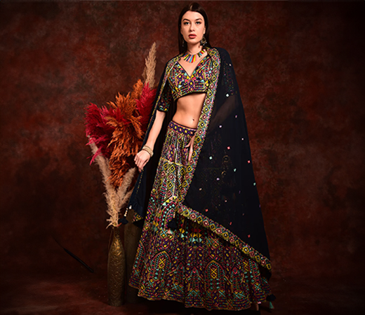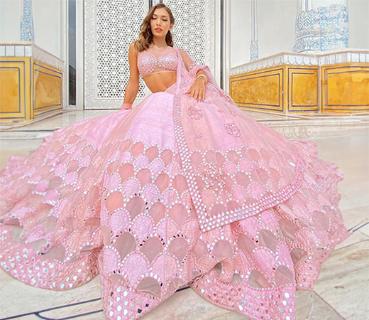 Wear pearl jewellery, dainty diamonds, and coloured stones to enhance the royal vibe. Get a flawless base, rosy cheeks, and a bold lip with curly money pieces framing your face. If not palaces, you can also go for palatial gardens, heritage properties, or historic forts that can capture the grandeur of your outfit.