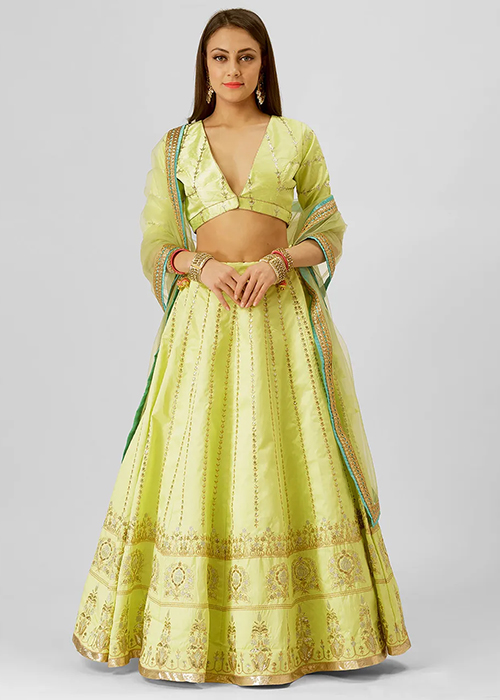 You don’t have to choose between keeping this traditional or taking the modern route with your outfit anymore. Sleek cut jacket sets or a minimal lehenga silhouette with intricate embroidery is the ideal melting point of both worlds. Take a closer look at our favorites this season below.
