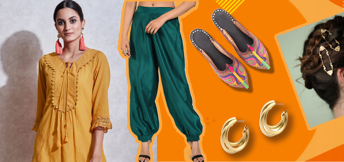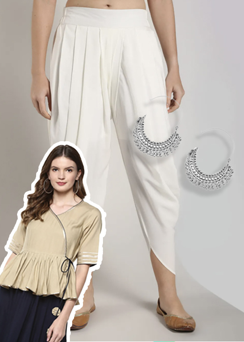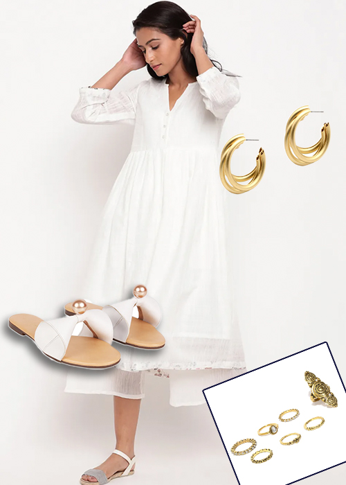 Shop the look: White kurta – True Browns, 2,240, Palazzos – True Browns, 1,499, Flats – Catwalk, 999, Earrings – Joker and Witch, 549, Ring set – Fabula, 501 We can all agree that white is to comfort what mac is to cheese. For this at-home all-white outfit recipe, we’ve mixed one cool cotton kurta, a pair of pared-back palazzos, fun flats for flavor and a sprinkle of stackable jewellery for good measure! Look 2: Dhoti off-duty