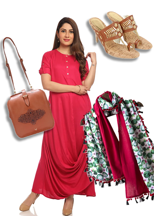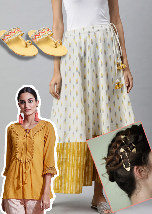 Shop the look: Kurti – Ritu Kumar, 3,135, Skirt – Jaipur Kurti, 775, Pins – Zohra,1,200, Kolhapuris – Jivaana, 999 Cotton kurti + slub skirt + cool Kolhapuris + pretty pins = The perfect look to take you from video conference calls to a virtual cocktail hour with your girls. Look 1: Fine print