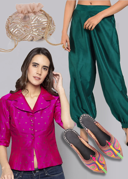 Shop the look: Jacket – Desi Weavess, 1,440, Pathani pants – Abhishti, 1,599, Potli bag – Ozel, 7,505, Mojaris – In Weave, 1,999 We can’t even begin to tell you about the ways an ethnic jacket like this one can come handy – it can replace your blouses for lehengas and sarees, it can double up as a cool cover-up for ethnic layering and it can be worn lone with your denims too for a fusion look. For this outdoorsy look we’re going with a gemstone theme and styling this amethyst jacket with a pair of emerald-hued pathani pants. Lastly, a pretty potli bag and multi-colour mojaris to zhuzh the look up.