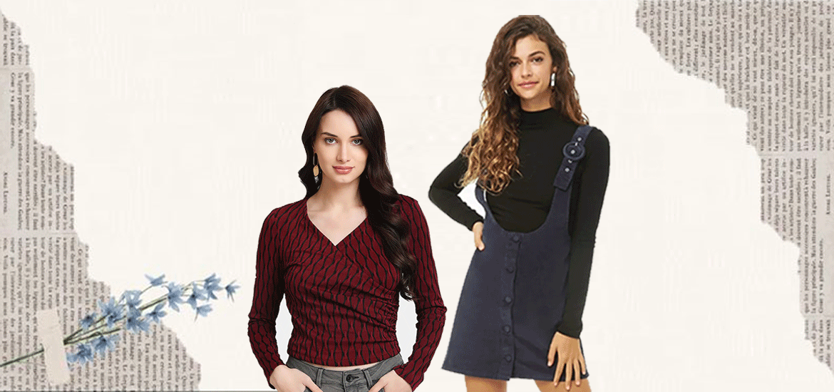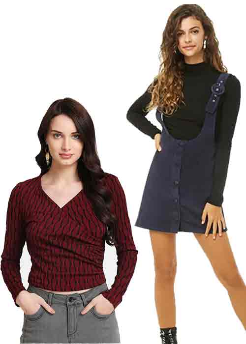 Soft and snug, knitted tops, especially full-sleeved ones, pair perfectly with pinafore dresses. You can opt for a solid on print look or vice-a-versa; you can get a denim pinafore, a velvet or a corduroy one. This look is perfect for a casual day out or even a pleasant day in.