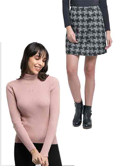 Woolen skirts have always been the quintessence of comfort clothing. You can wear them with turtleneck sweaters for an evening party, or a cute pastel V-neck during office hours. When you step out, try pairing this look with knee-high boots.