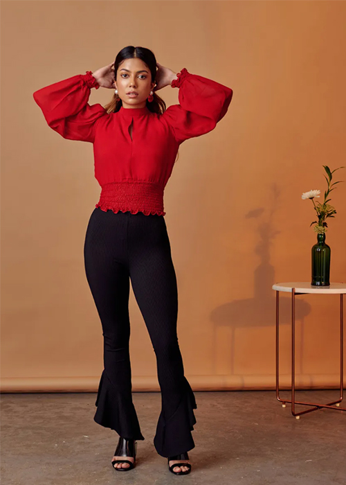 2. Make a dramatic appearance in this highly detailed top with balloon sleeves and ruched-waistline. Don’t forget to round off the look with dainty earrings.