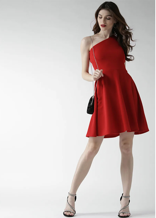 3. Be party-ready in this flirtatious one-shoulder dress, and make sure to finish the look with a pair of strappy heels and wrist accessories.