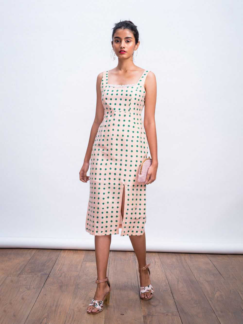 Circles are doing the rounds on everything from second-skin dresses to jumpsuits. But if polka dots are too pretty for you, try the season’s squares that go from gingham to microscopic.
