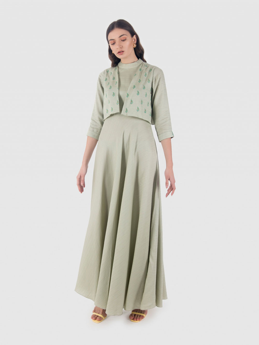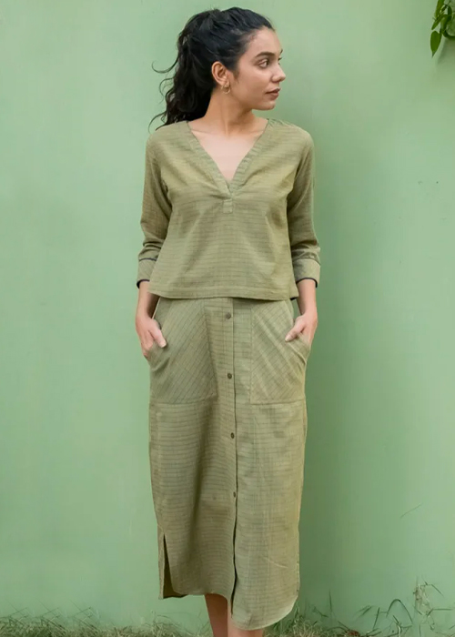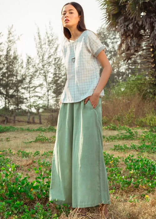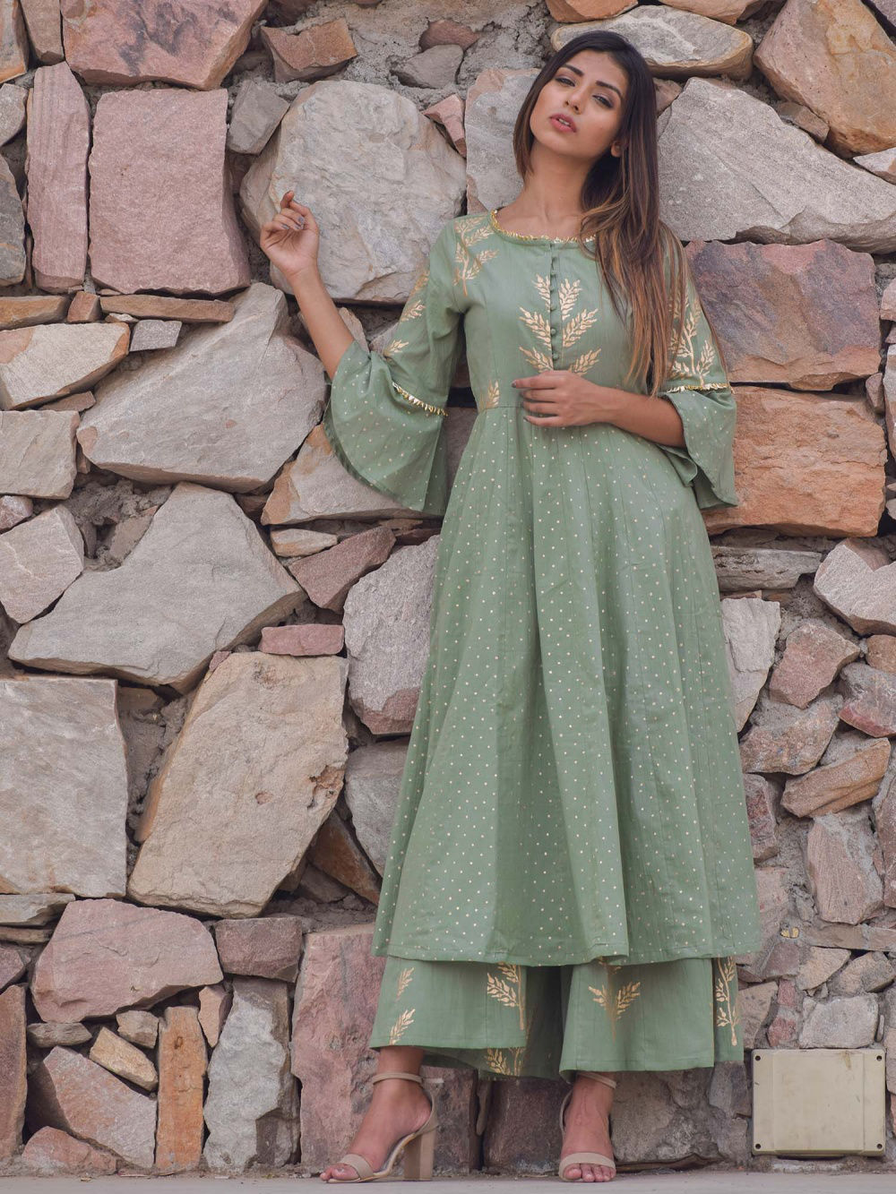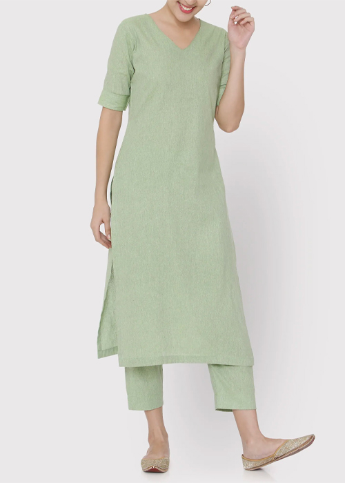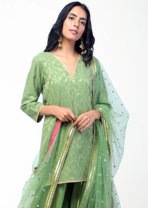 While we’re not quite ready to bid farewell to the saturated hues that ruled this summer, we think it’s time to let the autumnal colour palette ease into our closets–one trendsetting tone at a time. And before you think it’s one of the midnight hues warranted for winters, you’ll be surprised to find out that it’s the unexpected pistachio green! Think iterations of sage, mint and even olive. The common denominator on multiple F/W’19 runways – from Sally La Pointe’s sultry satin separates and Marc Jacob’s tailored pieces with beanies to match to Jil Sander’s gradient layers and Ryan Roche’s anti-fit ensembles – head-to-toe pistachio was the hero at every show. Furthermore, we find that the colour not only pairs well with shades of beige (also a big trend) but works well for the warmer weathers too due to its pale undertone. Need proof? Fashion insiders and celebrities are already channelling the hue on the streets and on their Instagram feeds. Whether it’s Gigi Hadid in her power-packed pistachio pantsuit at Heron Preston’s presentation at Paris Fashion Week or Irina Shayk’s itsy-bitsy holiday outfit, she sported in Florence, we’re convinced that the pale green palette is here to stay. Below, we’ve rounded up some cool contemporary styles in our favourite gelato hue and have thrown in some ethnic essentials for good measure too! We recommend you keep these pistachio pieces handy and pair them with matching or tan and white accessories to stay ahead of the fashion curve.