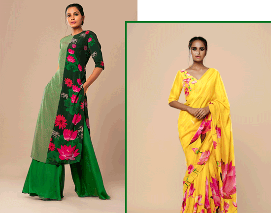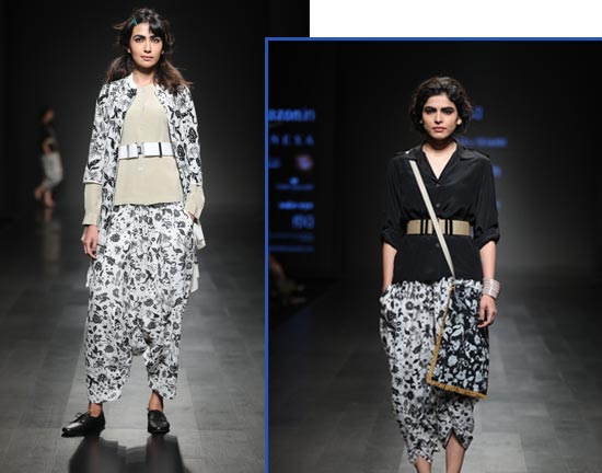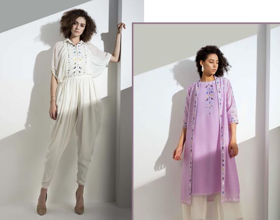 Drawing inspiration from the streets of Delhi, this designer duo’s #SadakSmart collection comprises of richly patterned floral fabrics inspired by some of the great Indian chintzes. While the colour palette ranges from soft khakis and creams to shades of coral and olive green, juxtaposed with black and white, the cotton and silk fabrics form the base. You can expect to find eclectic modern silhouettes reflecting everything Indian street.