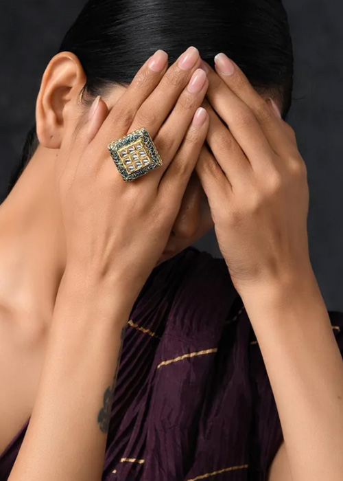 This kundan cocktail ring has been painstakingly crafted by the country’s artisans. Wear it with a traditional saree and high heels or switch things up by slipping it on with an ethinic jacket and a pair of high-rise jeans.
