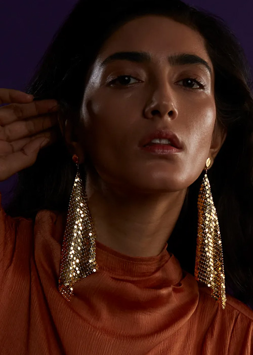 Born from a brand that revels in all things ethnic and homegrown, these earrings made out of mesh flow a lot like fabric. They can easily be worn with both a salwar set and a cocktail gown.