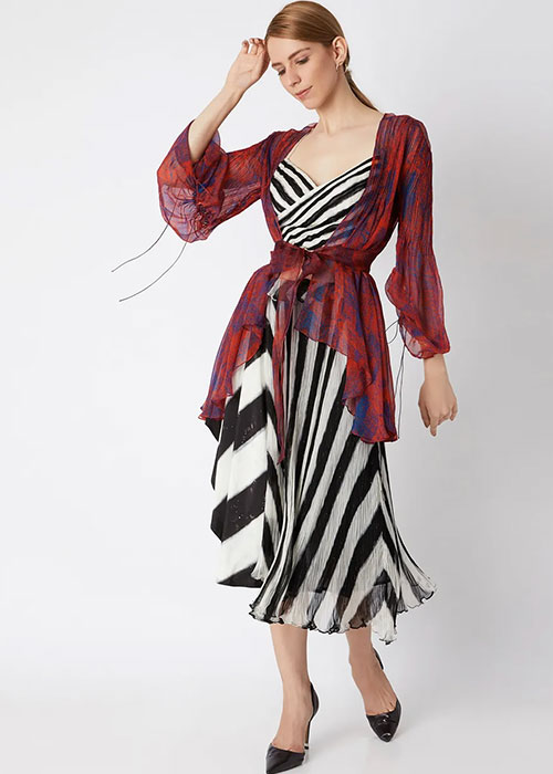 Saaksha and Kinni Multi-Color Printed Embroidered Shrug, Blueberry Gold Plated Layered Chain Detailing Necklace